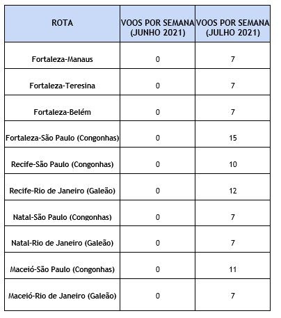 Entre os novos voos estão: Fortaleza-Manaus; Fortaleza-Teresina; Fortaleza-Belém; Fortaleza-Congonhas; Recife-Congonhas; Recife-Galeão; Natal-Congonhas; Natal-Galeão; Maceió-Congonhas; e Maceió-Galeão.“Os dados acima refletem a retomada sustentável da operação brasileira da companhia, que está mais otimista com o avanço do processo de vacinação e com os sinais de recuperação da economia. A expectativa é que, até o final deste ano, a Latam retome 100% da oferta de assentos no doméstico que tinha na pré-pandemia”, explica Diogo Elias, diretor de Vendas e Marketing da Latam Brasil.